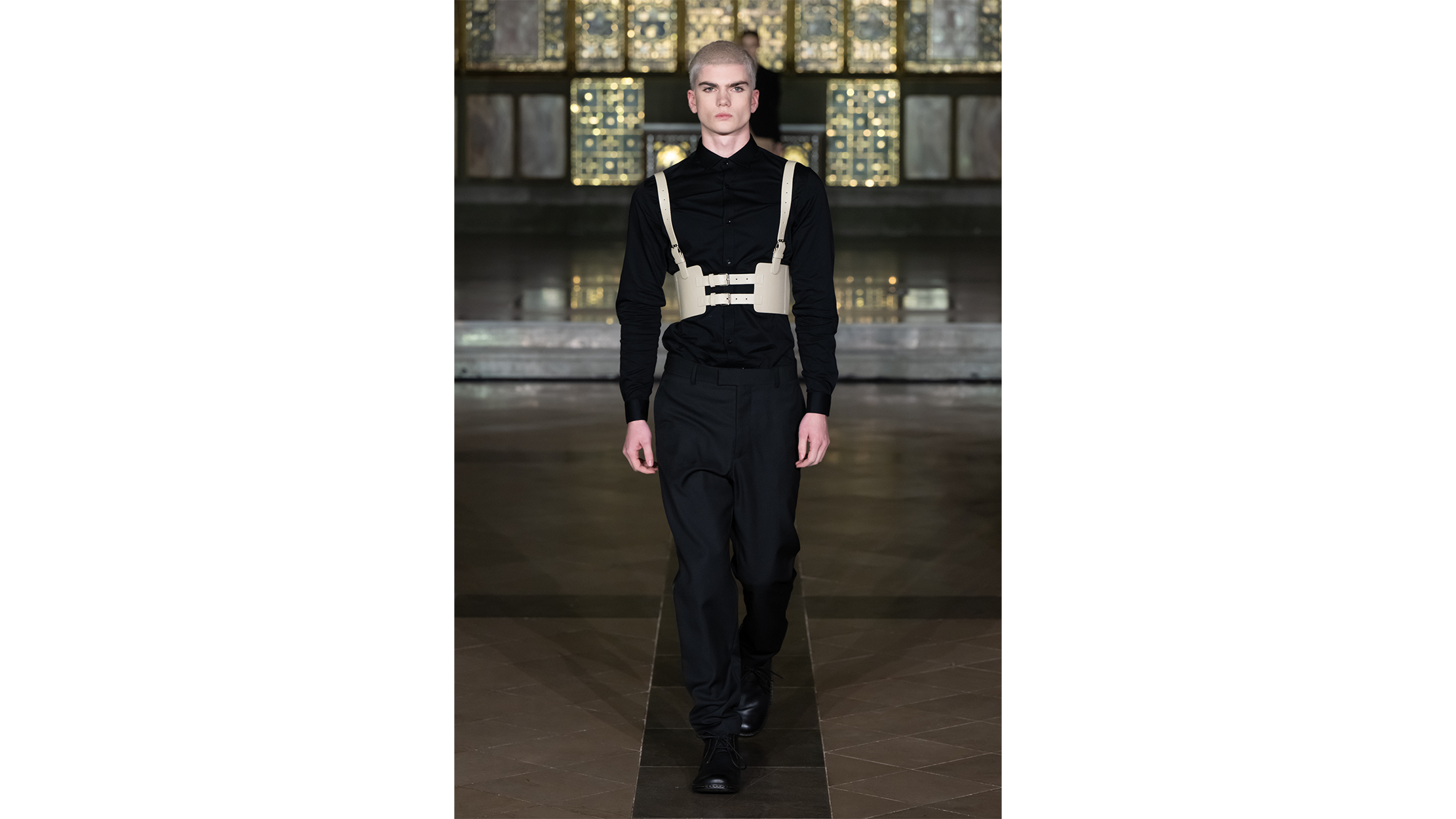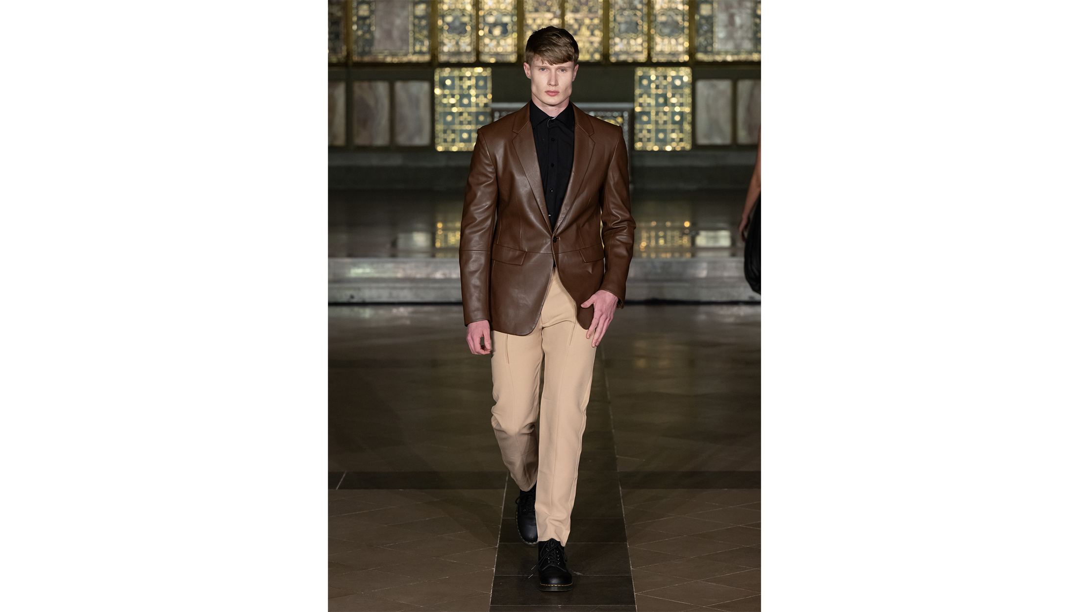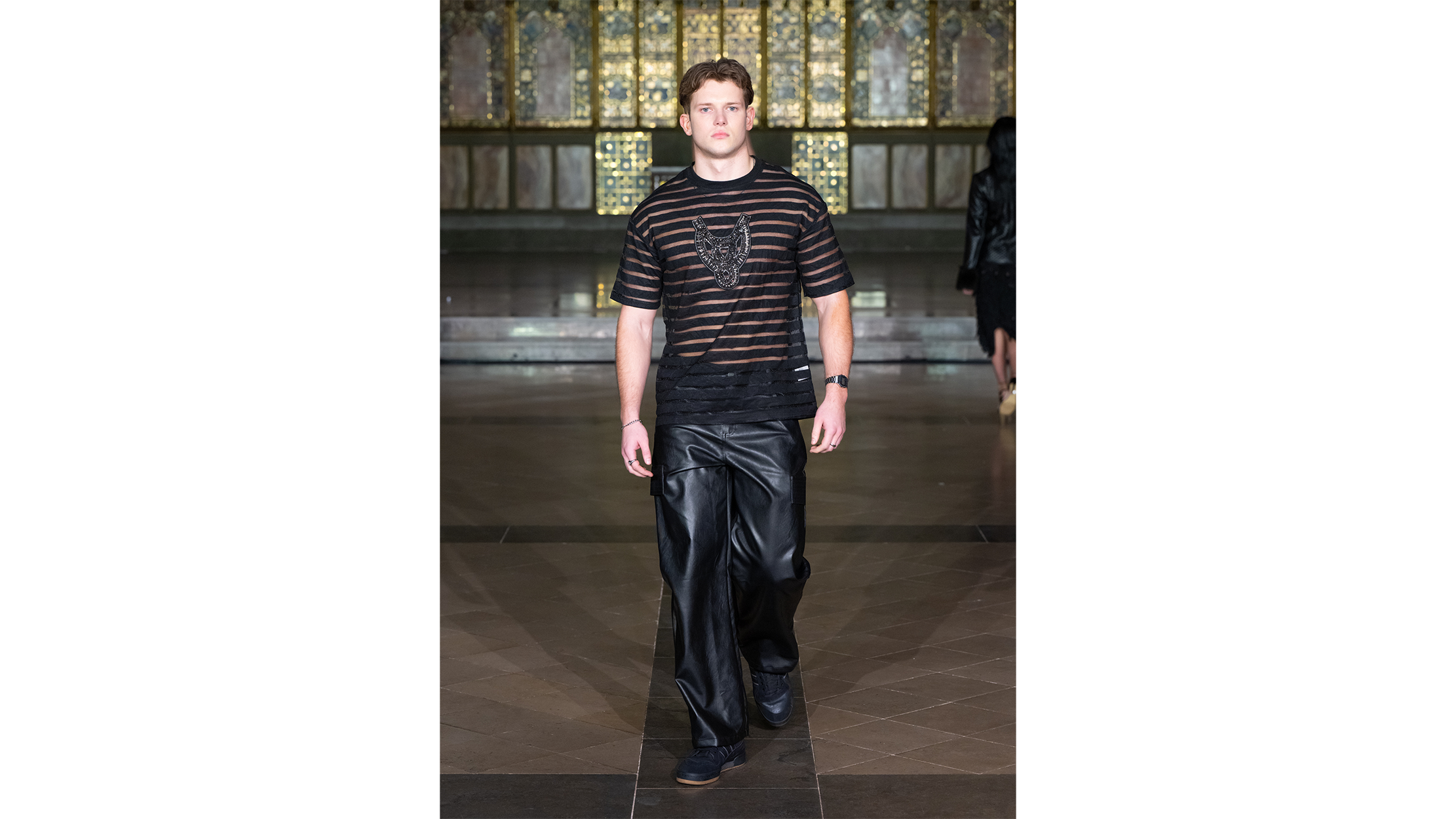 The gilded mosaics caught the runway lights and threw them back in fragments — gold, amber, a dozen shades of honey — as if the building itself were breathing. The venue, a neo-Gothic hall in central London with vaulted ceilings and marble panelling that belongs more to prayer than to fashion, lent every look that crossed its polished floor the gravity of a procession. Guests lined the nave in tight rows, phones raised like votive candles, their faces half-lit by the ornate screens behind the runway. It was the kind of space that makes you whisper, which is perhaps why, when the first model appeared, the silence felt earned rather than imposed.