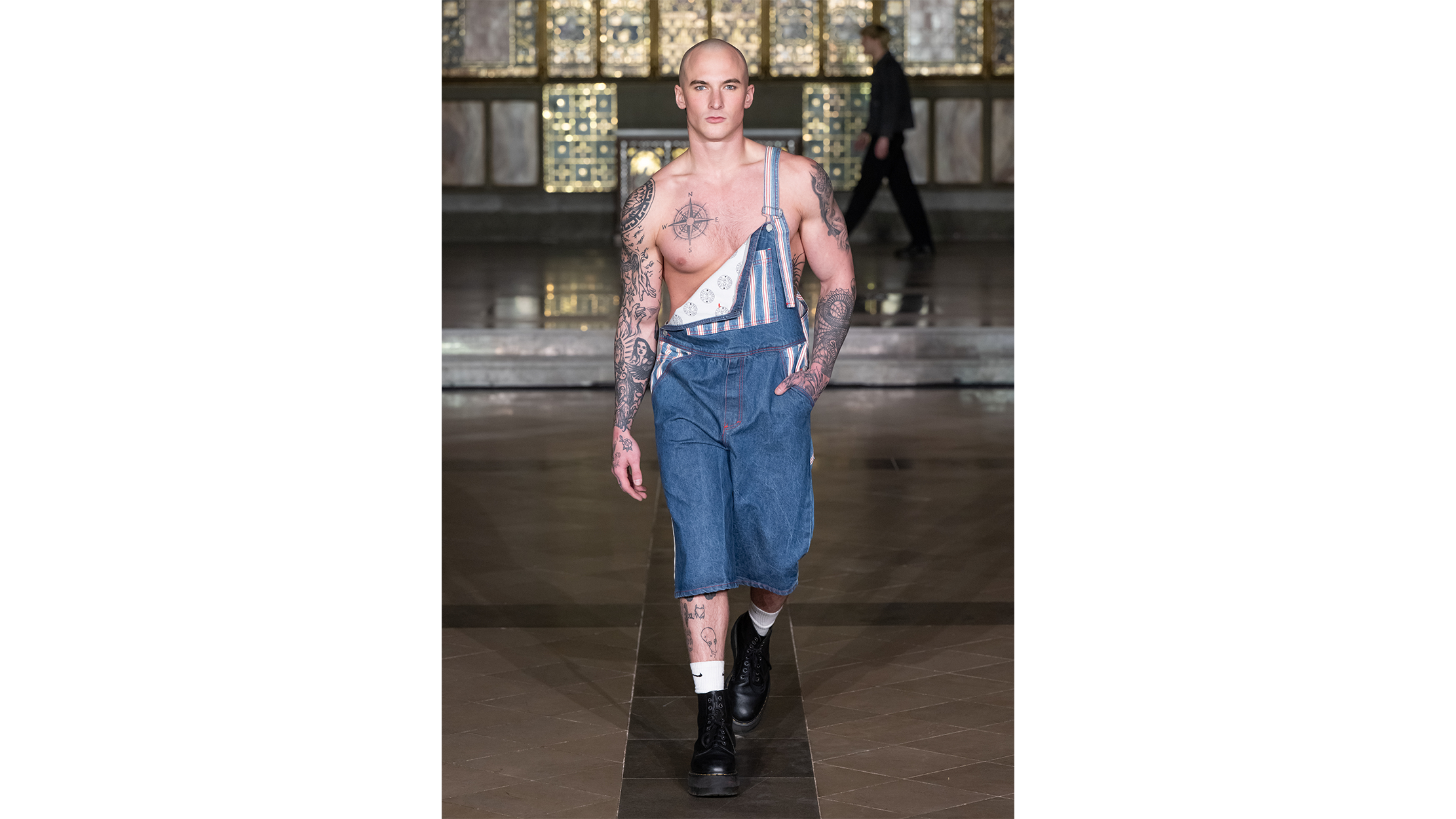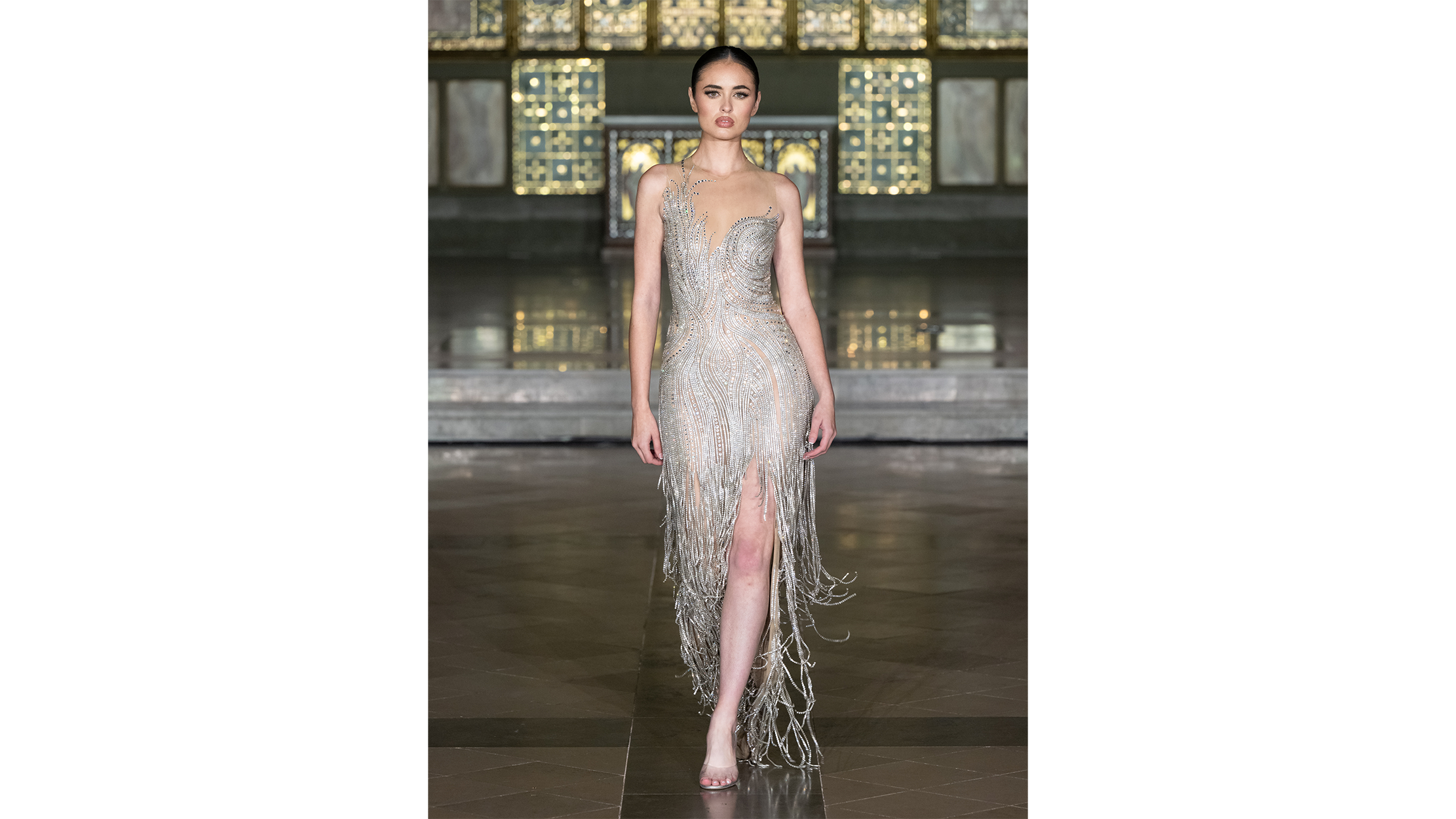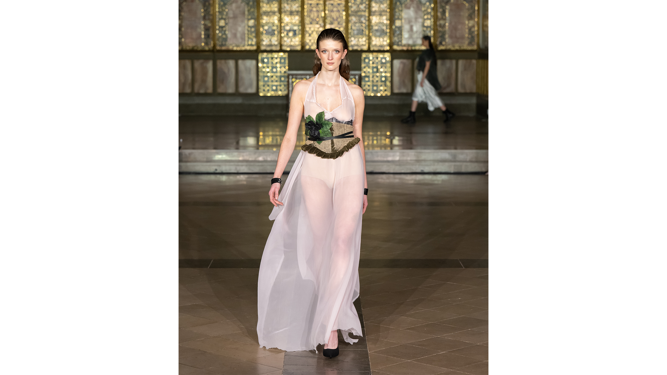 The gilded mosaics caught the runway lights and threw them back in fragments — gold, amber, a dozen shades of honey — as if the building itself were breathing. The venue, a neo-Gothic hall in central London with vaulted ceilings and marble panelling that belongs more to prayer than to fashion, lent every look that crossed its polished floor the gravity of a procession. Guests lined the nave in tight rows, phones raised like votive candles, their faces half-lit by the ornate screens behind the runway. It was the kind of space that makes you whisper, which is perhaps why, when the first model appeared, the silence felt earned rather than imposed.