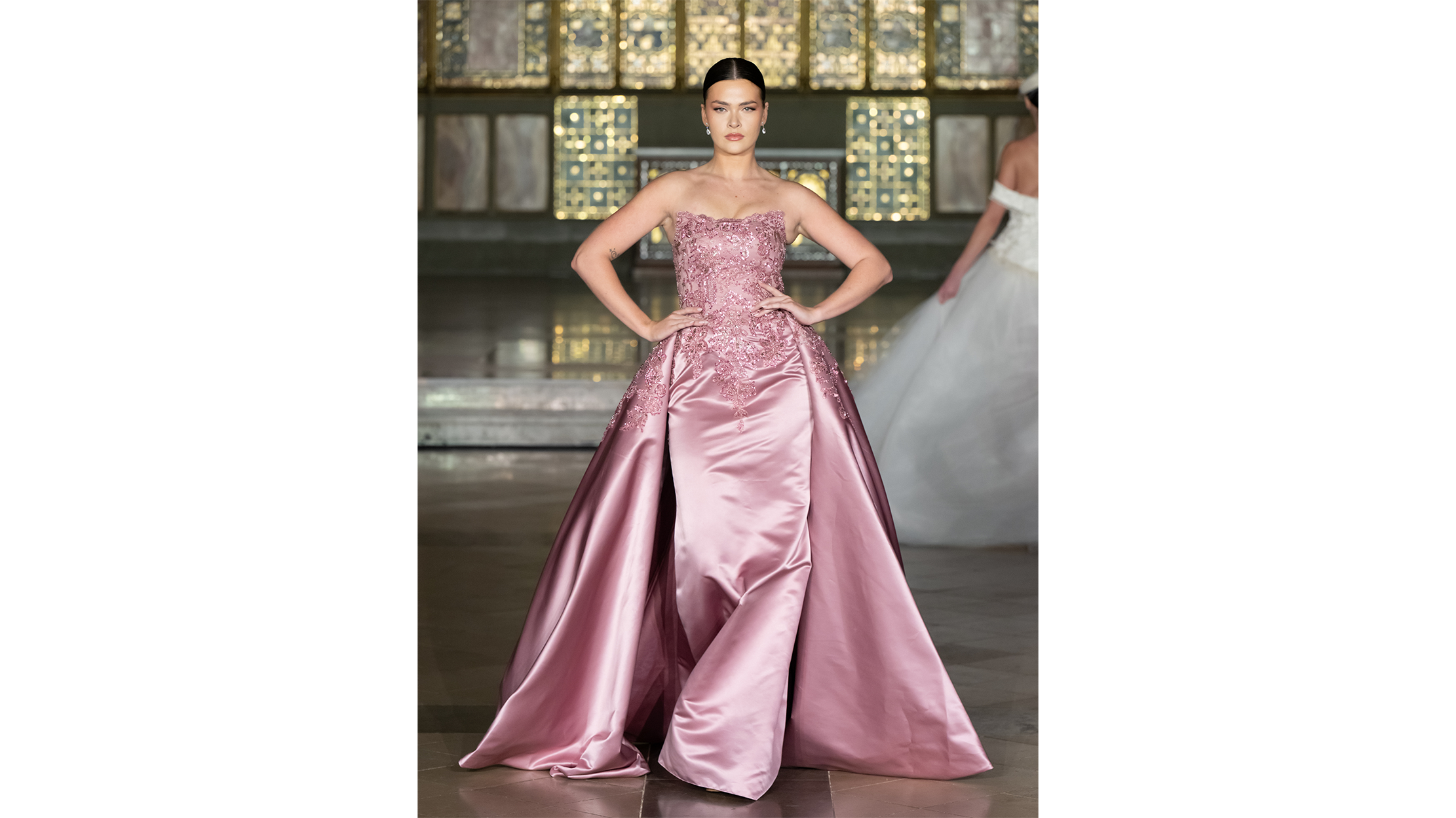 Then the mood shifted, and the gowns arrived. A strapless dusty-rose number in heavy duchess satin featured a bodice dense with lace appliqué and sequin embroidery that cascaded downward past the waist, dissolving into the skirt's luminous surface. The satin caught every angle of light, pooling from blush to mauve in its folds, and the model stood with her hands at her hips as if daring the fabric to upstage her. A bridal gown followed — ivory satin with a full, sweeping skirt and a high-neck lace bodice whose sleeves extended into a cathedral-length veil trimmed in matching floral lace. Against the mosaic panels of the venue, the look dissolved the boundary between fashion and architecture, the veil's scalloped edges echoing the arched windows behind it. It was the kind of entrance that stops a room twice: once for the spectacle, and once for the craft.