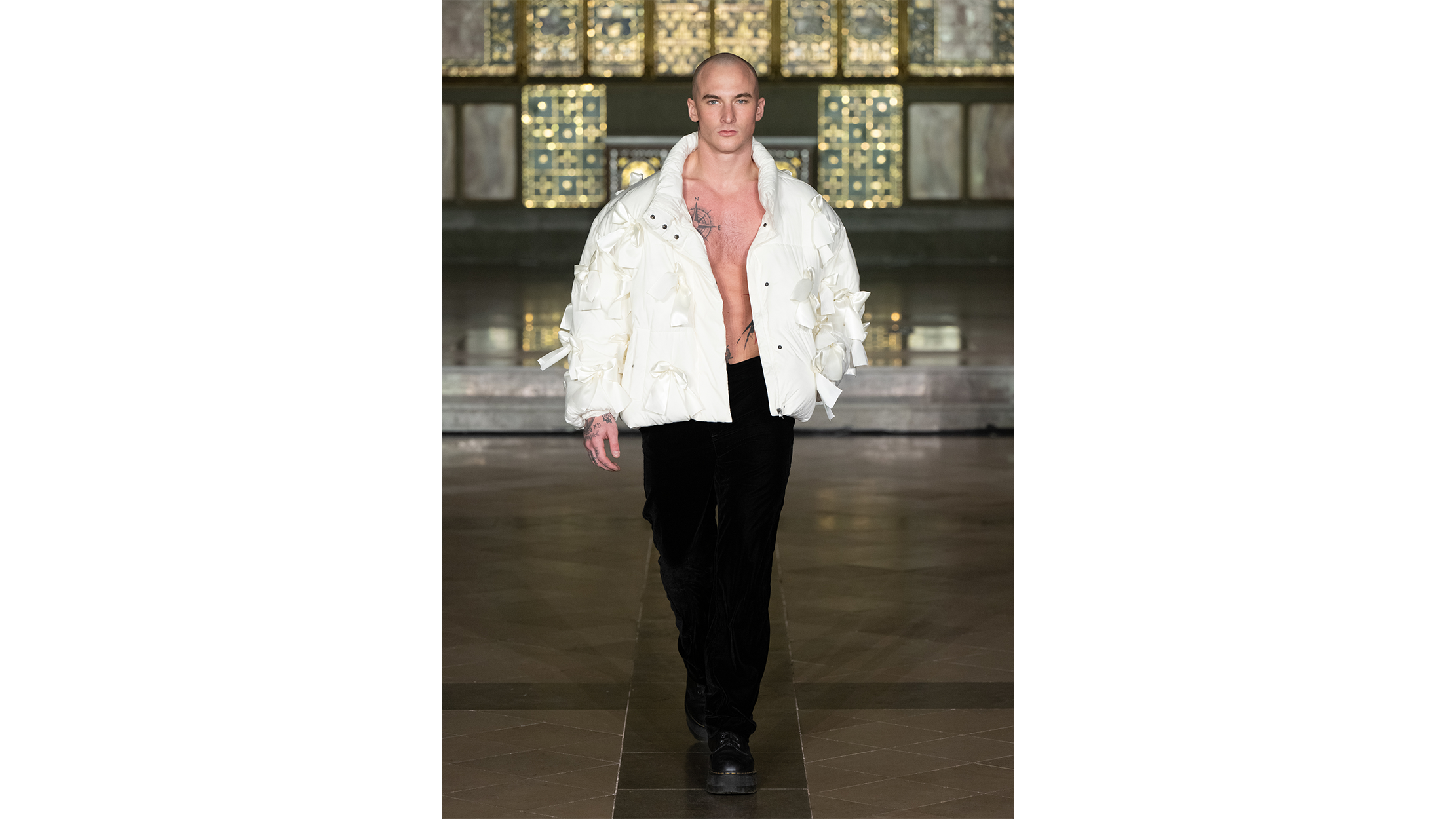 The show opened with menswear that played roughness against refinement. An oversized white puffer jacket, worn open over bare skin and black velvet trousers, was covered in fabric bows — knotted, scattered, almost haphazard across the quilted surface, as though someone had tried to gift-wrap armour. The bows caught the light differently from the jacket's matte shell, their satin sheen flickering as the model moved. It was a piece that demanded you reconcile two instincts: the desire for warmth and the desire for ornament. Later, a model walked in a full zebra-print ensemble — a voluminous cape draped across the shoulders and falling past the knees, paired with matching drawstring shorts — that turned the bold graphic into something almost sculptural, the black-and-white stripes distorting and curving with the weight of the fabric as he strode. The effect was less "animal print" and more optical event, the pattern shifting with each step as if the textile had its own kinetic energy.