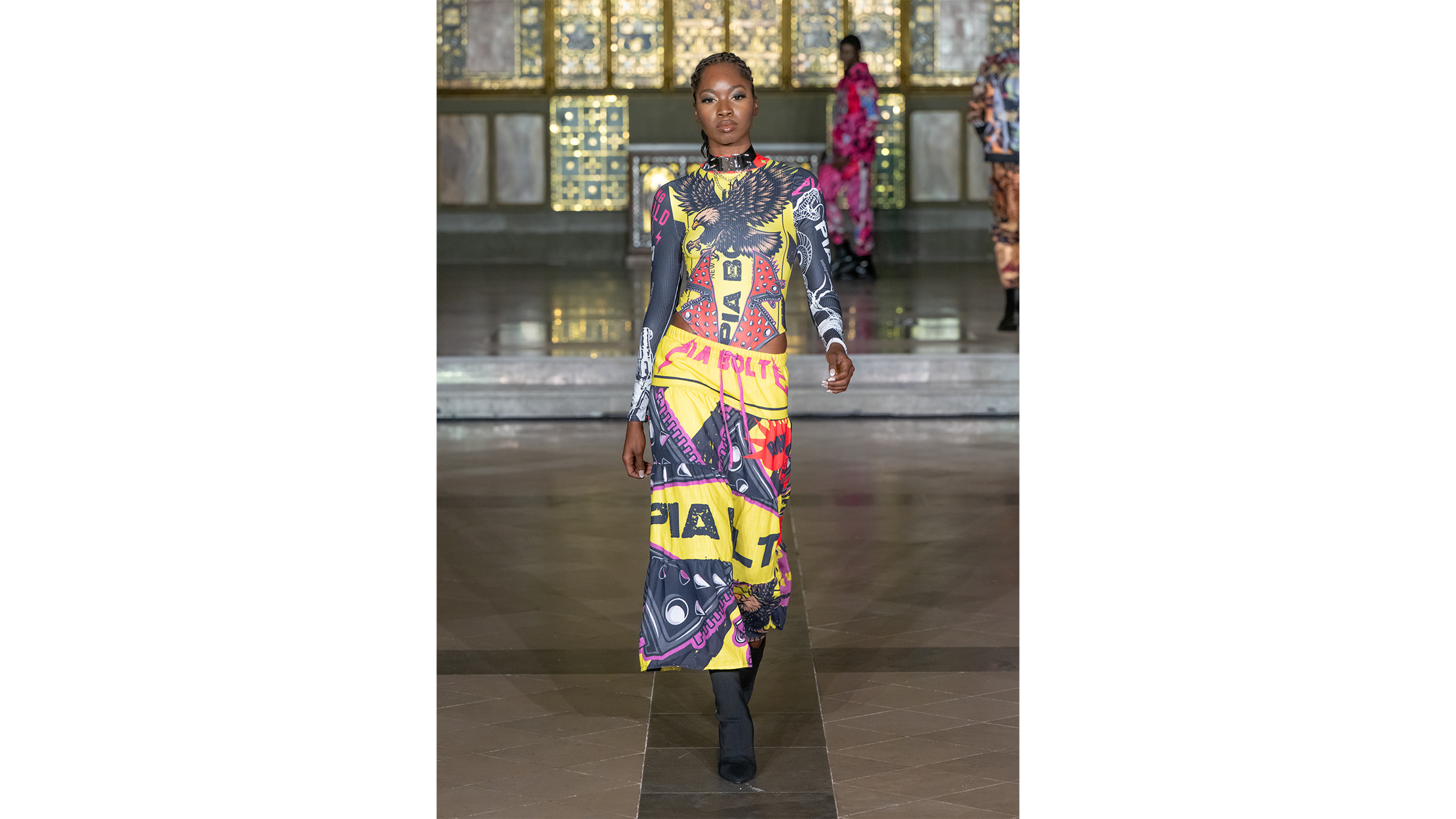 Pia Bolte's contributions were impossible to miss. A sleeveless maxi dress carried the German designer's name directly into the print — the words "PIA BOLTE" and "DANGER" rendered in bold block lettering alongside peace signs, graphic illustrations, and splashes of red and pink, the whole surface reading like a broadsheet pulled apart and reassembled as evening wear. The garment moved with a surprising lightness despite its visual density, the hemline sweeping across the dark floor as the model walked between rows of onlookers in the nave. A second Bolte look amplified the volume: a fitted long-sleeve top and midi skirt in electric yellow, charcoal, and magenta, anchored by a sprawling eagle motif across the chest. The print work was layered and almost aggressive in its saturation, pulling from punk poster aesthetics and tattoo flash art in equal measure. Worn with a slim metal collar and black boots, it turned the model into a walking manifesto — the clothing not merely worn but declared.