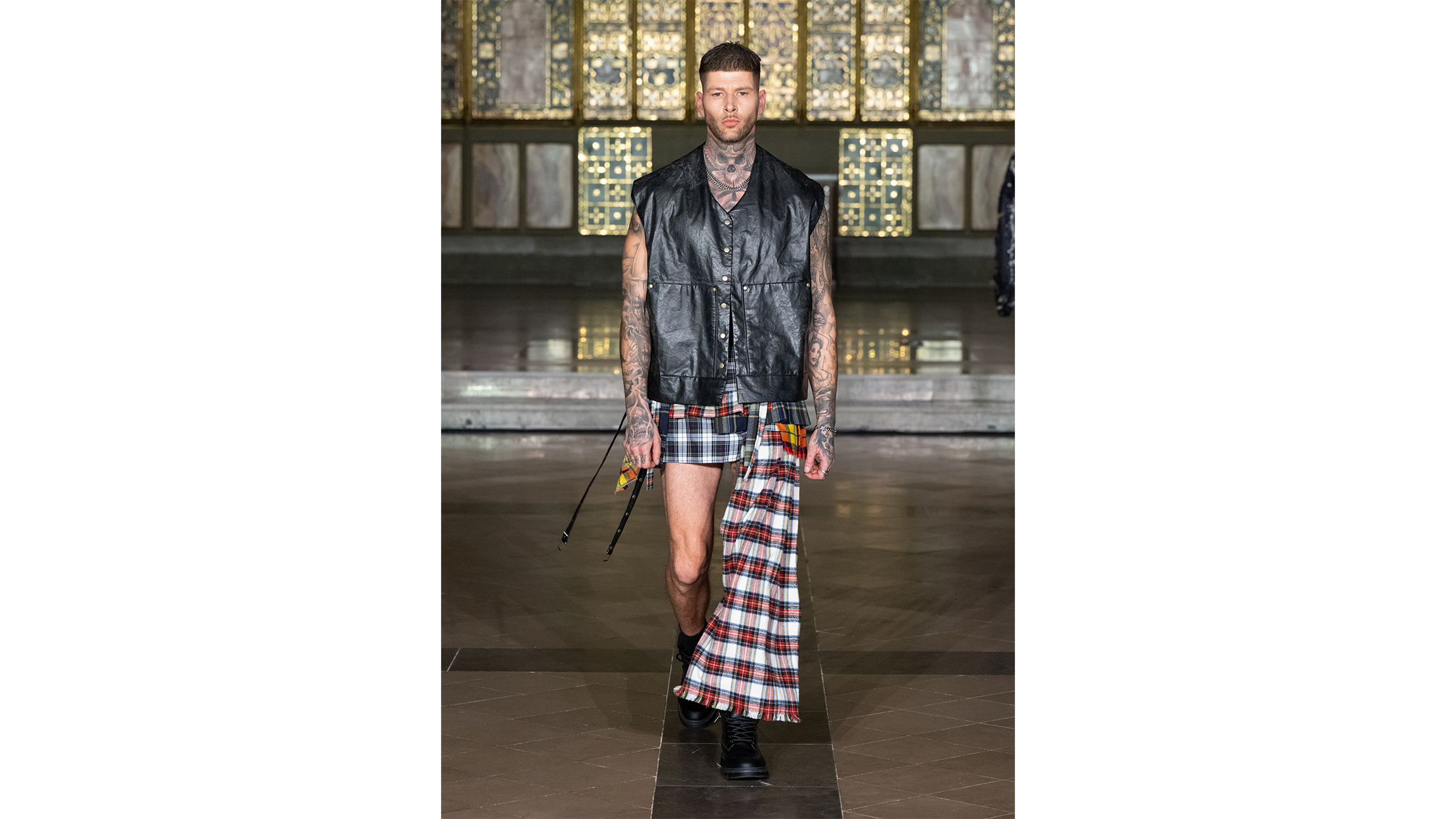 The menswear continued to unsettle expectations. A sleeveless black leather vest, its surface creased and worn-looking, was paired with deconstructed tartan shorts and a long panel of mixed-plaid fabric trailing from the waist — Stewart, Dress Gordon, and a muted cream check all stitched together, the raw frayed edges visible even from the middle rows. The effect was Highland heritage put through a punk shredder, the tartans refusing to coordinate, refusing to resolve into a single identity. Elsewhere, a model in head-to toe black — button-down shirt, tailored trousers, lace-up boots — wore a pale leather harness across the chest, its straps and buckles sitting flush against the dark fabric like a functional corset reimagined for a man's frame. The piece sat somewhere between military rigging and couture accessory, its cream leather immaculate against the inky backdrop. And in one of the show's quieter menswear moments, a rich chocolate-brown leather blazer was cut with the clean lines of classic Savile Row tailoring, worn over a black shirt and sand-coloured trousers — a look that didn't need to shout, its luxury carried entirely in the weight and sheen of the hide.