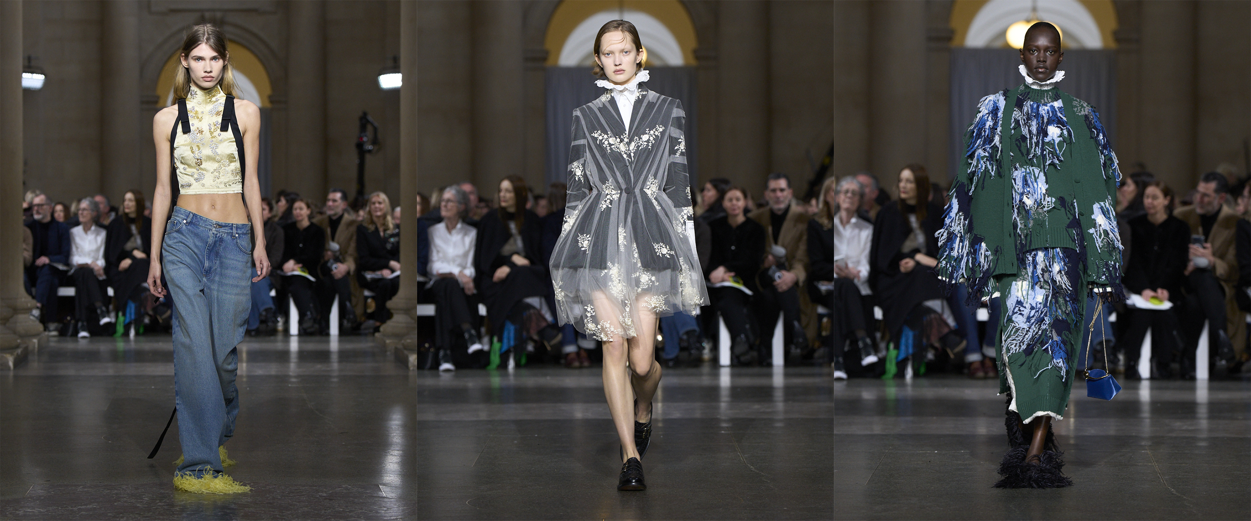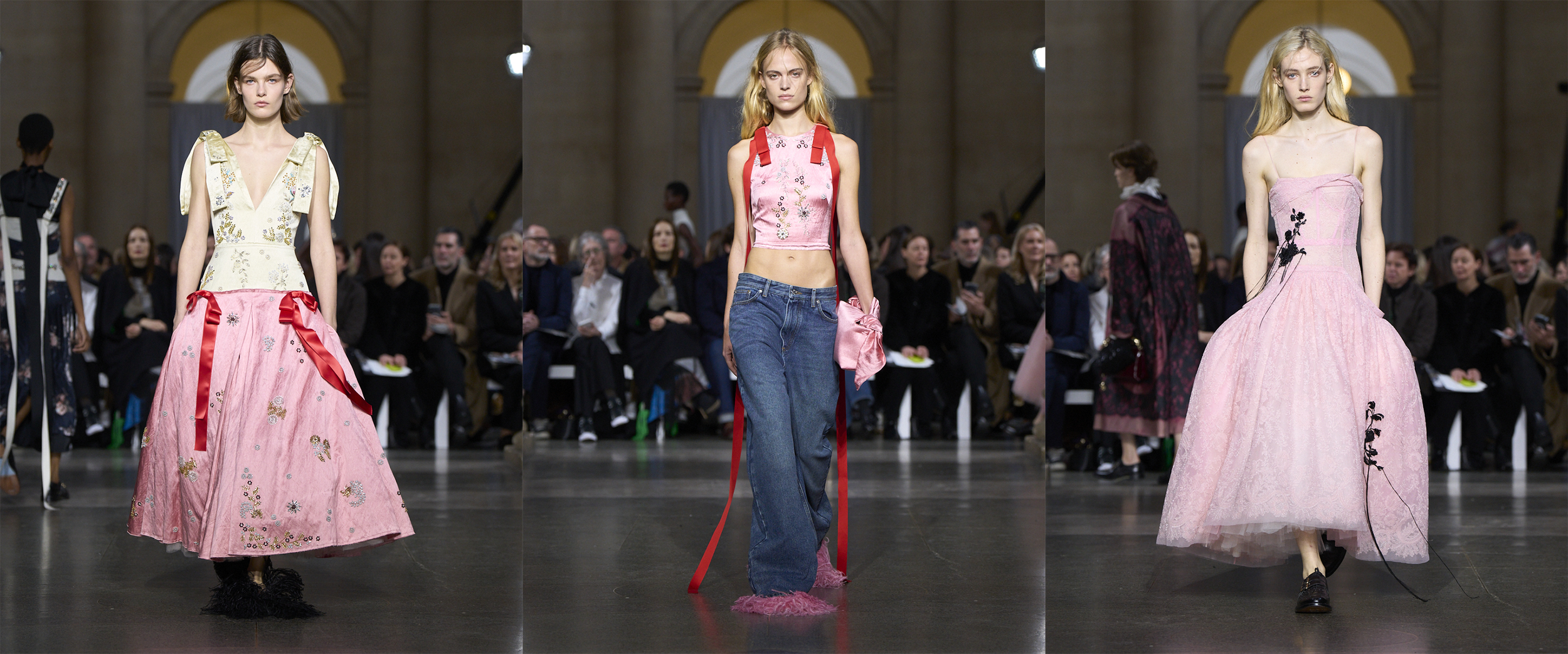 The recurring motif of florals such as hand-cut leather blooms, threadwork embroidery, engineered lace prints speaks directly to ERDEM’s design language. Flowers here are not fragile embellishments, they are symbols of resilience and transformation. Bows, crystal fragments, shredded trims, and inside-out seams reinforce the idea of garments in flux. Familiar tropes are undone and inverted, echoing the press release’s assertion that this is a collection about evolution, not retrospection.