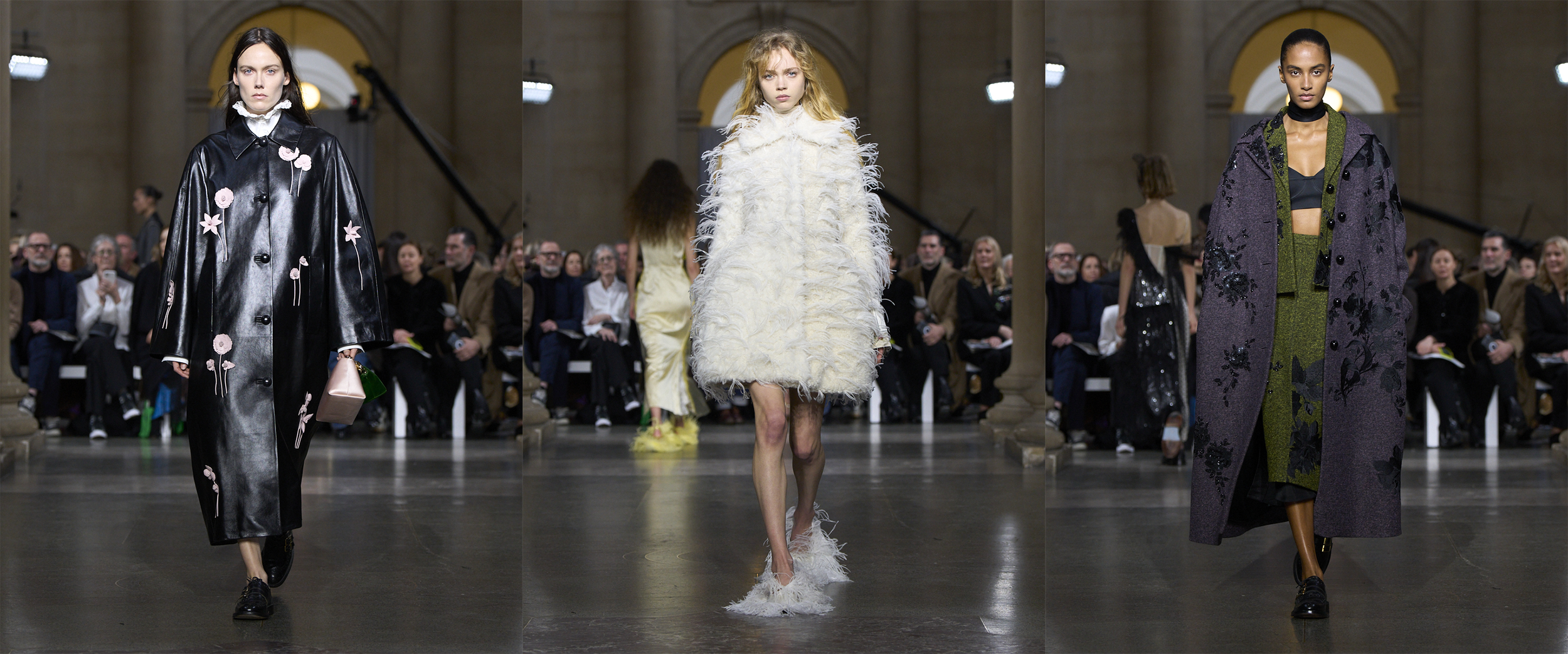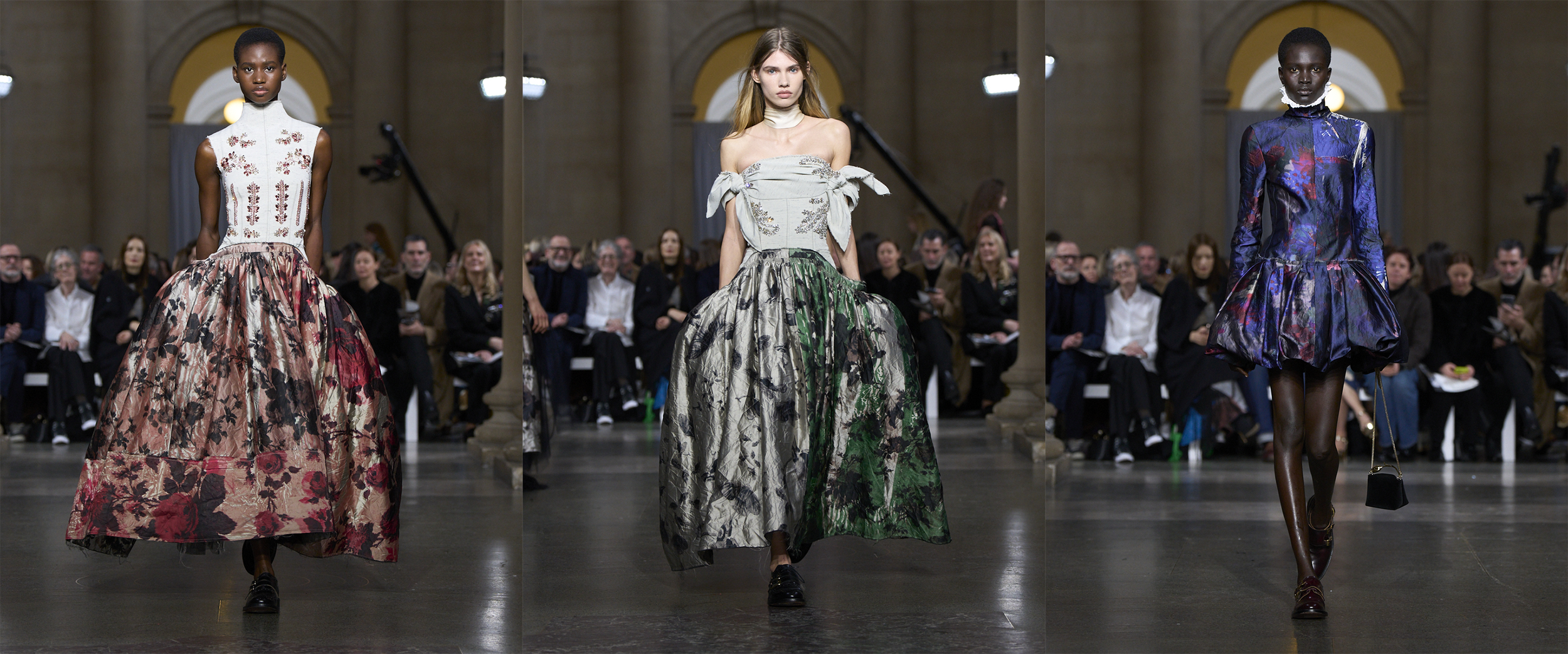 Silhouette is central to this evolution. The collection oscillates between sculptural hourglass tailoring and panniered volume, cocooning coats and elongated column dresses. Corsetry appears not as confinement, but as framework—an architectural anchor amid draped tulle and pieced satin. Opera coats and sharply cut jackets lend gravitas, while skeletal pannier structures and ballooned skirts introduce a romantic theatricality. ERDEM’s woman remains composed, but she is also in motion like caught mid-transformation.