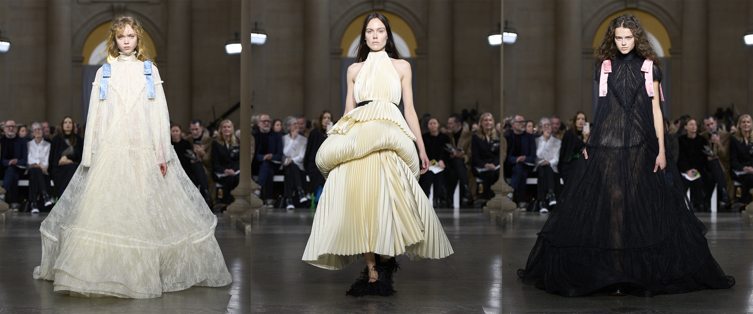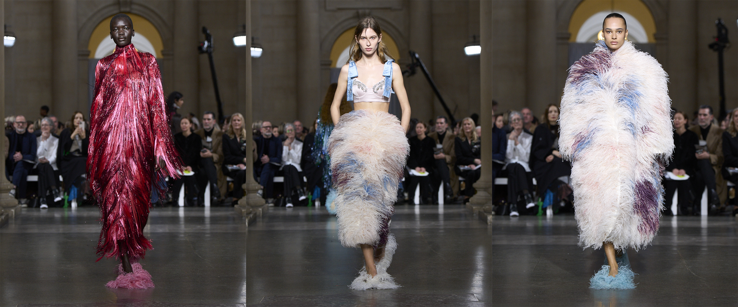 The color palette unfolds like a narrative arc. Black and ivory ground the collection in the house’s signature chiaroscuro elegance, while saturated pinks, ruby reds, saffron yellows, forest greens, and inky blues pulse through textured satins and jacquards. Powder pink ostrich feathers, malbec velvet, cyanotype lace prints, and silvered textures inject dimension. These hues feel emotionally charged rather than decorative, each tone carrying the weight of memory, each contrast amplifying the conversation between eras.
