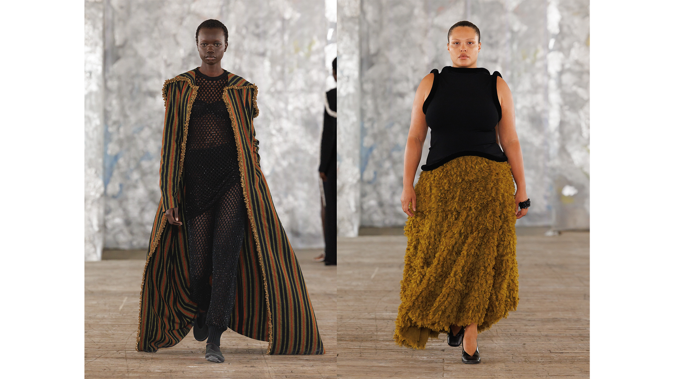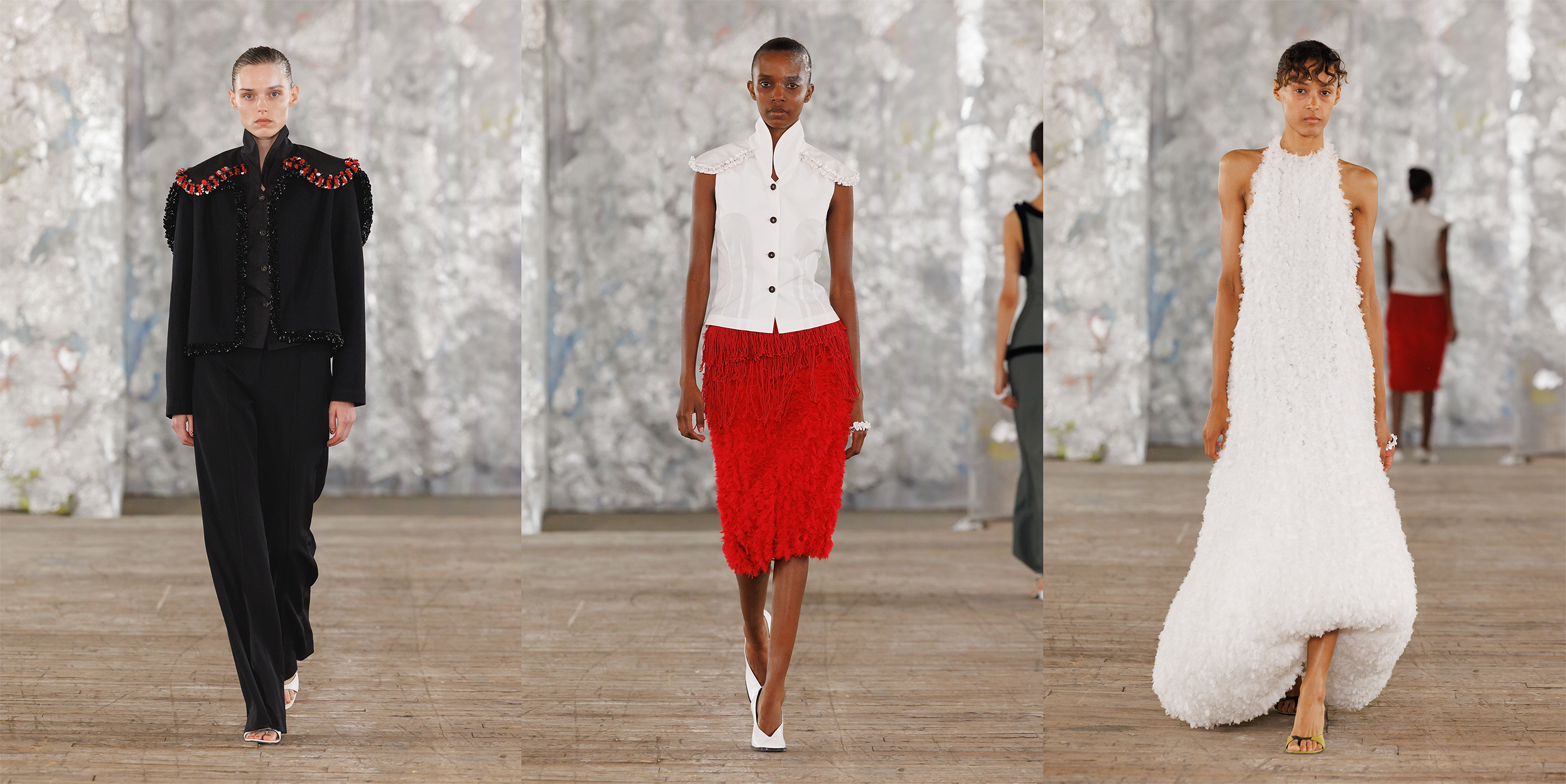 The Baby Doll is seen in tailored buttoned-ups and skirts that have a shredded effect due to the macrame and threaded peplums while closing the show with the voluminous proportions and lightweight dramatics of Dame Lorraine, unrestricted by her coverage of feathers.