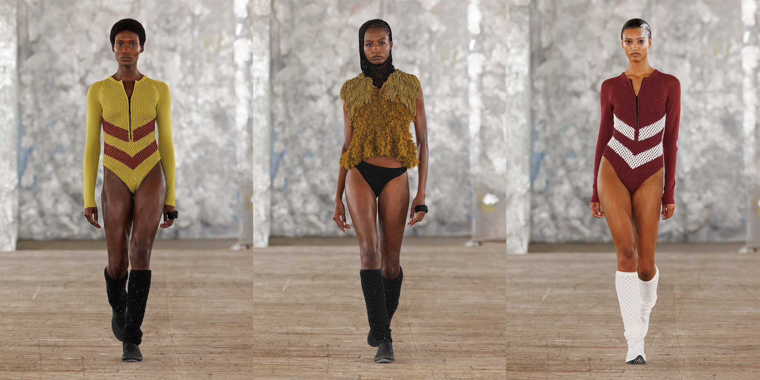 The Sailor archetypes don duster coats adorned with hand-melted paillettes, wear matte viscose crepe knits featuring tubular chenille ribs, tunics embellished with thread peplums and knit jersey styles with sailor collars. Among the fabric, new life is breathed into the famous cage bras.
