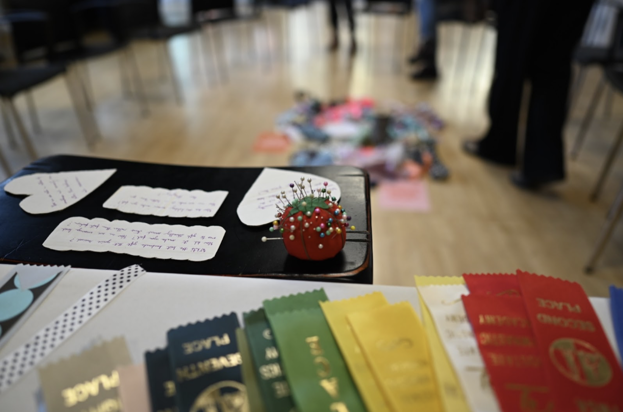 Rosie is pictured with her models at far right wearing one of the upcycled award ribbons.