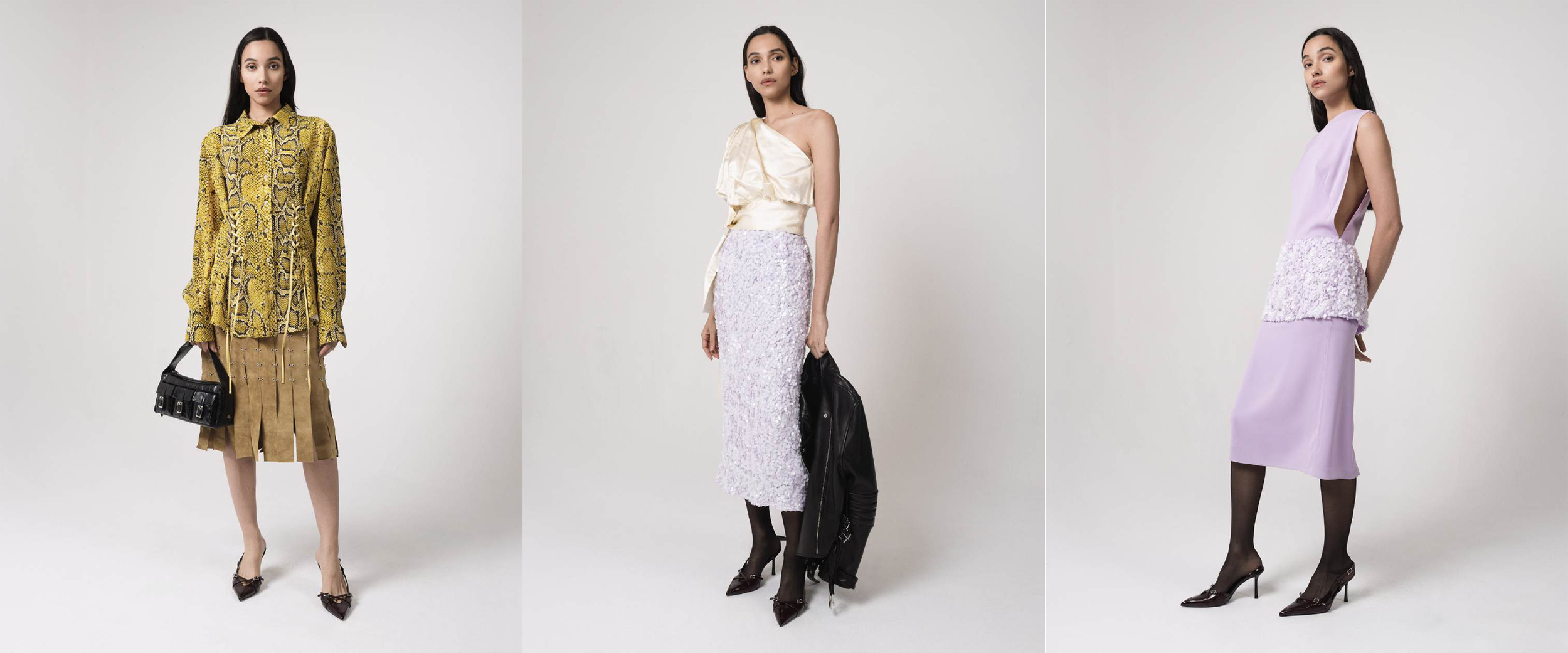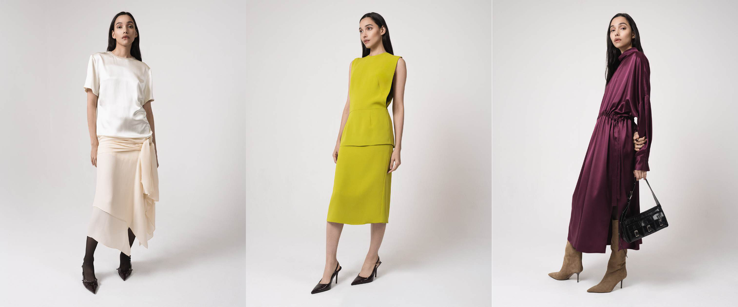 The palette reinforces this mood. Deep burgundy, espresso brown, ochre, and classic black anchor the collection in autumnal depth, while ivory, cream, and soft sand bring moments of lightness. A bold ochre snake print in crepe de chine refreshes the label’s iconic lace-up shirt, injecting pattern and movement into the lineup. Occasional flashes of chartreuse and lilac feel deliberate: vibrant but grounded, yet never overwhelming.