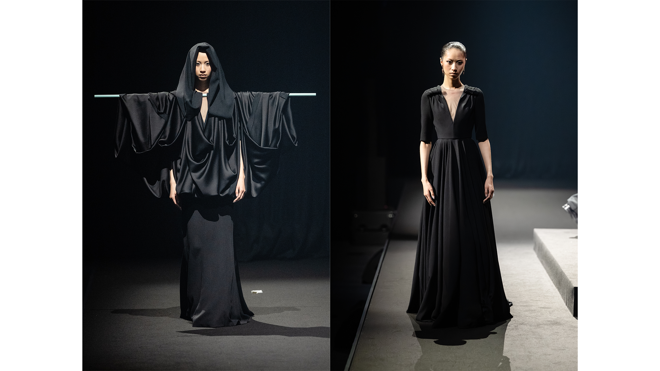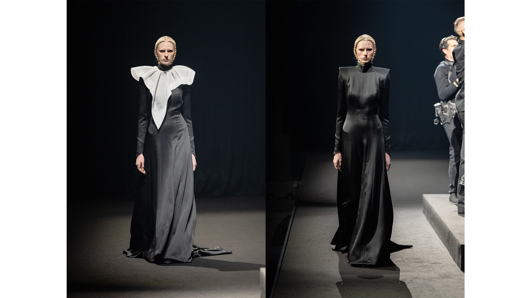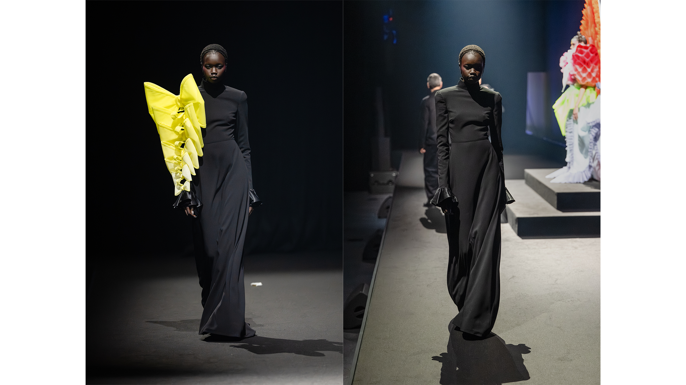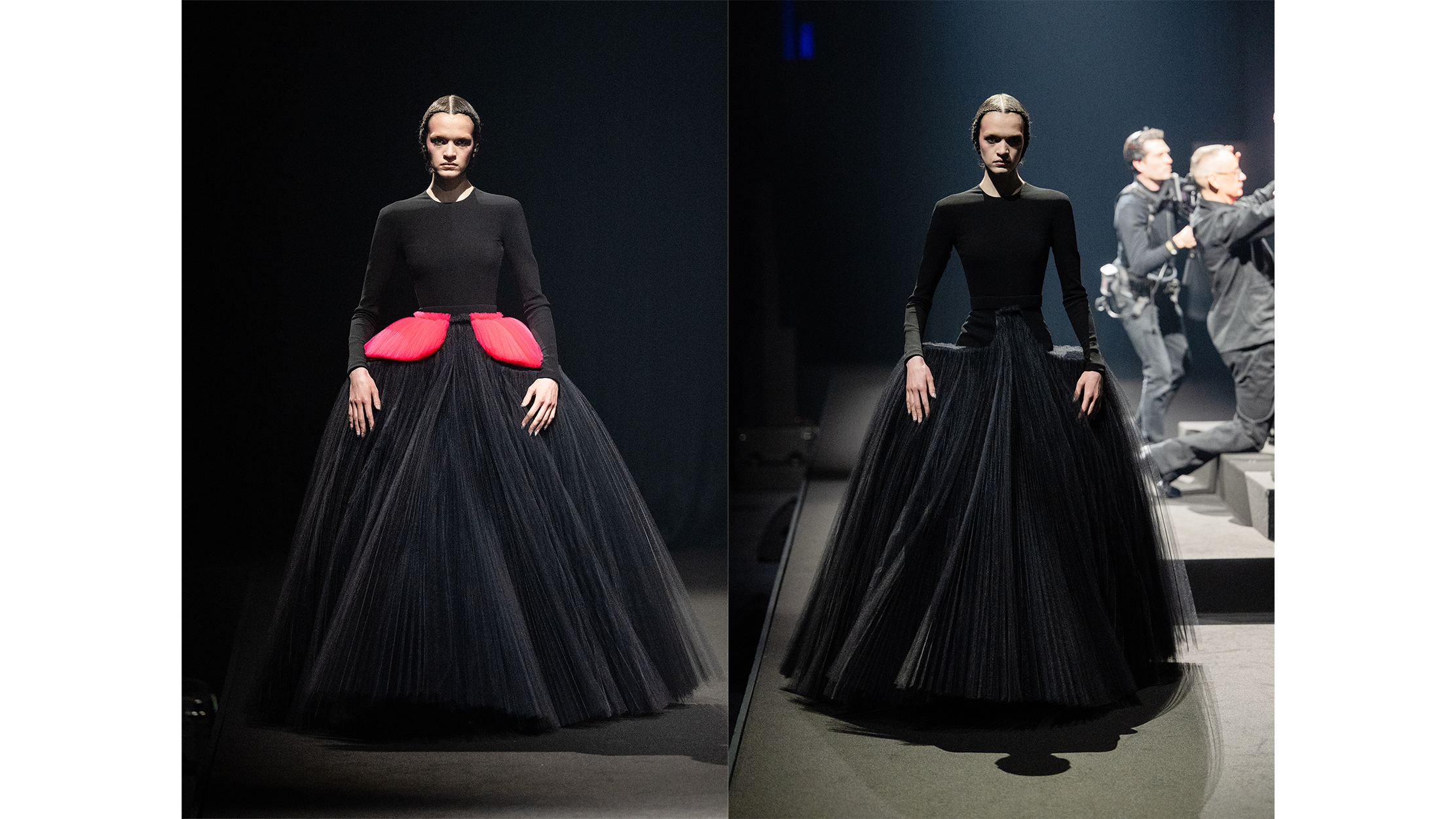 The show opened up with a series of architectural black dresses that were seen as the ultimate “blank canvas.” Throughout the performance, designers Viktor Horsting and Rolf Snoeren appeared on stage to remove elements and attach them to other looks, transforming each outfit in real time.